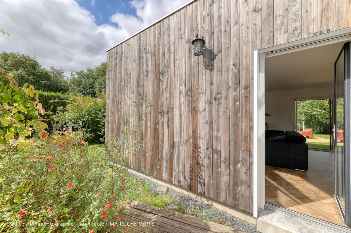 Projet bois ; captation et contrôle des apports solaires passifs disponibles en façade Sud ; usage de matériaux biosourcés et recyclables, bois PEFC France.