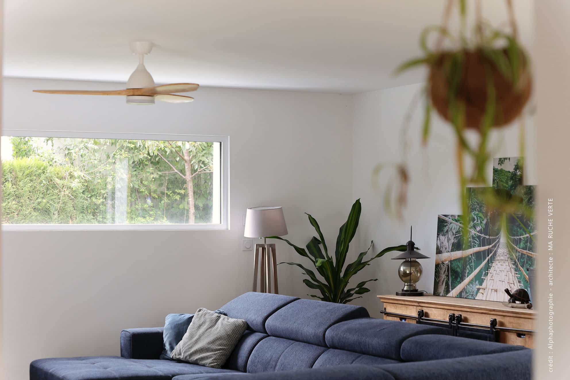 Installée en retrait depuis la rue, l’extension en ossature bois accueille un salon lumineux et paisible, ouvert sur le jardin et pensé comme un véritable lieu de partage et de convivialité.