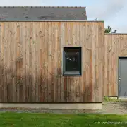 Ossature bois bardée sur sa face externe de Douglas (PEFC) en pose horizontale. Les volets roulants et leurs coffres sont positionnés à l’arrière du bardage bois. Isolation thermique biosourcées par Biofib’trio. Couverture par membrane EPDM.