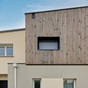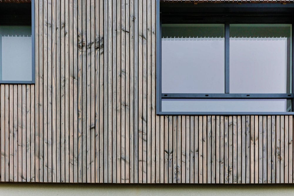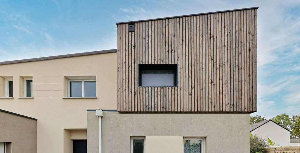 L’enveloppe du projet sera en ossature bois bardée sur sa face externe de Douglas (PEFC) avec une finition type VIBRATO en pose verticale. Les volets roulants et leurs coffres sont positionnés à l’arrière du bardage bois. Isolation thermique biosourcées par Biofib’trio. Couverture EPDM.